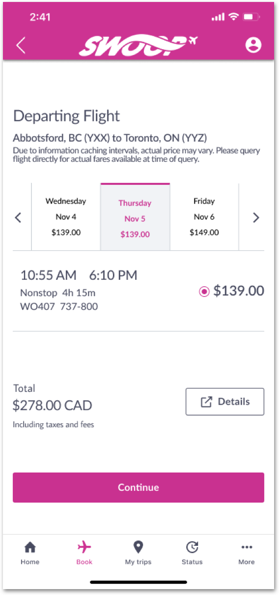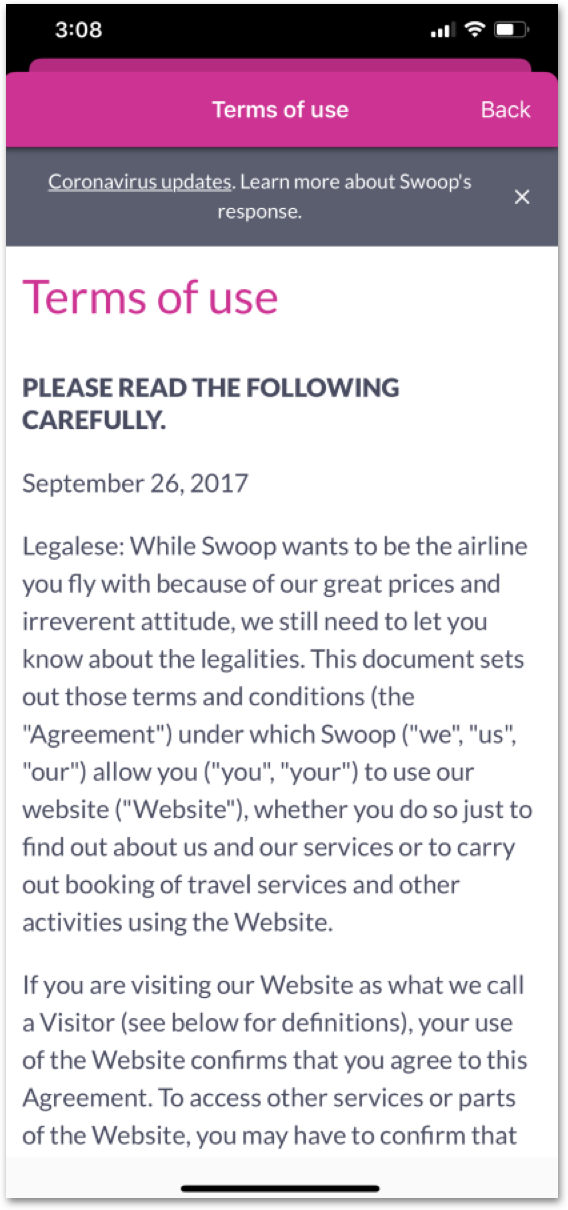 We decided on Swoop Airlines due to its poor app store rating, relative size of the company and it’s clear heuristic violations on our first look.